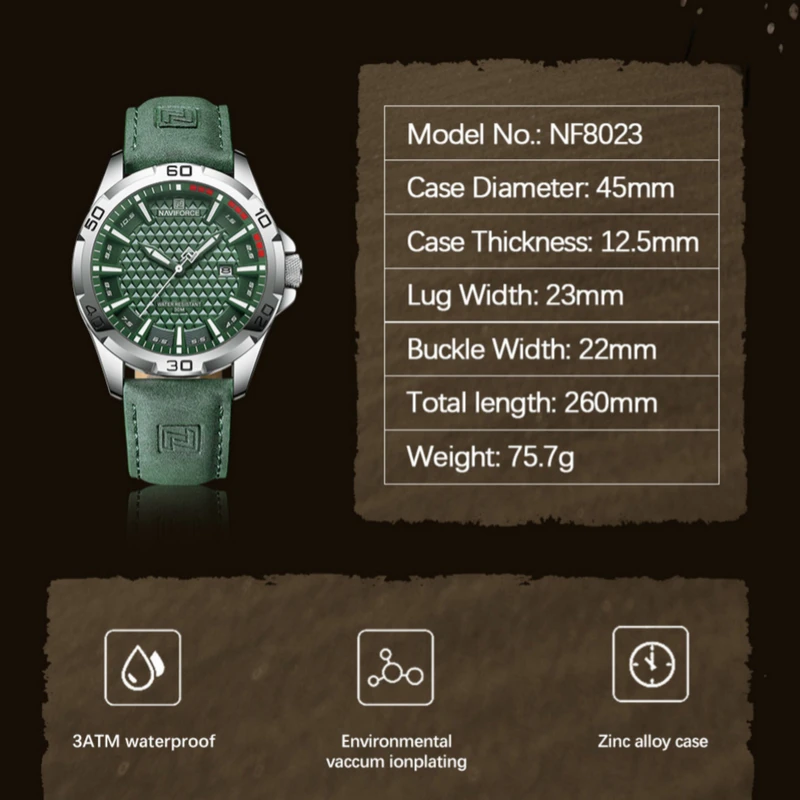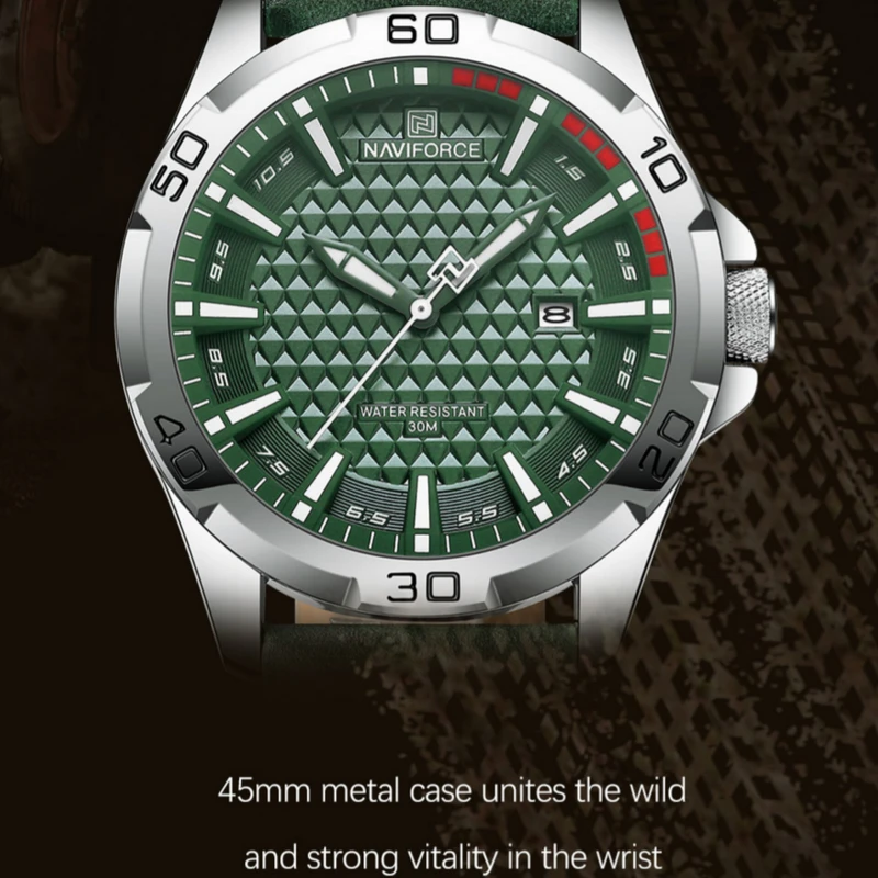 طراحی شیک و مقاوم ساعت مچی عقربهای مردانه نیوی فورس مدل NF8023-S/GN یک انتخاب عالی برای افرادی است که به دنبال ظاهری شیک و جذاب هستند.