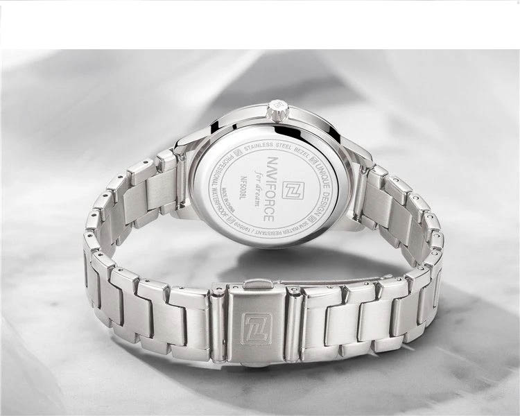 ساعت مچی عقربهای زنانه نیوی فورس، مدل NF5008، تلفیقی است از طراحی لوکس، رسمی و کلاسیک که در هر مناسبت و موقعیتی درخششی ویژه به شما میبخشد. این ساعت با طراحی چشمنوازش،